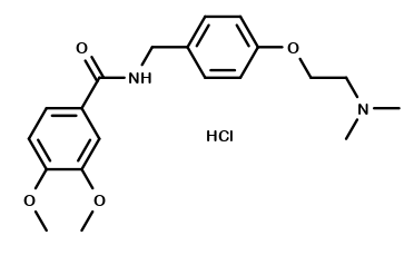 | Synonym : | N-({4-[2-(dimethylamino)ethoxy]phenyl}methyl)-3,4-dimethoxybenzamide hydrochloride; N-[[4-[2-(Dimethylamino)ethoxy]phenyl]methyl]-3,4-dimethoxy Benzamide Hydrochloride; HSR-803; HC-803; Itax; Ganaton; |