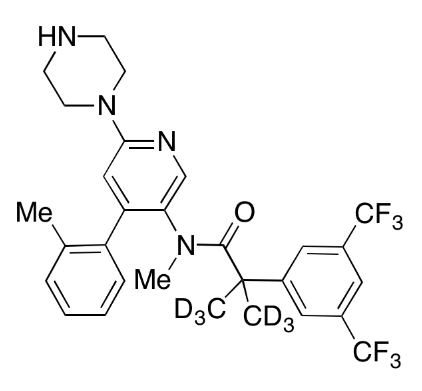 | Synonym : | N,?,?-Trimethyl-N-[4-(2-methylphenyl)-6-(1-piperazinyl)-3-pyridinyl]-3,5-bis(trifluoromethyl)-benzeneacetamide-d6;2-[3,5-Bis(trifluoromethyl)phenyl]-N-methyl-N-[6-(piperazin-1-yl)-4-o-tolylpyridin-3-yl]isobutyramide-d6 |